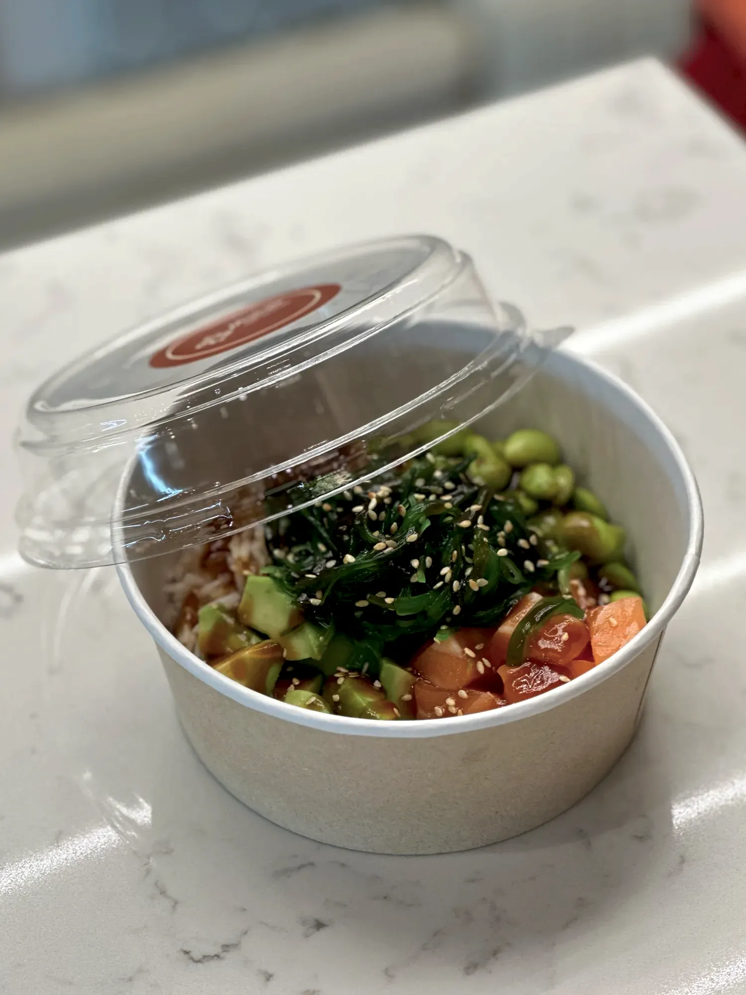 Слабо соленый норвежский лосось, спелый авокадо, рис басмати, чука-салат, соевый соус, кунжут