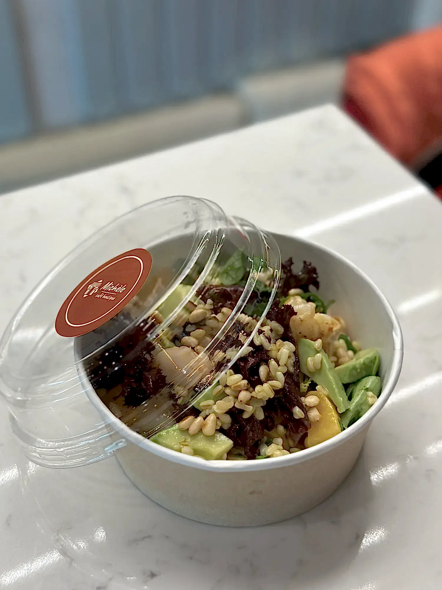 Креветки, булгур, авокадо, персики, микс-салат, кедровые орешки, сыр пармезан, авторский соус